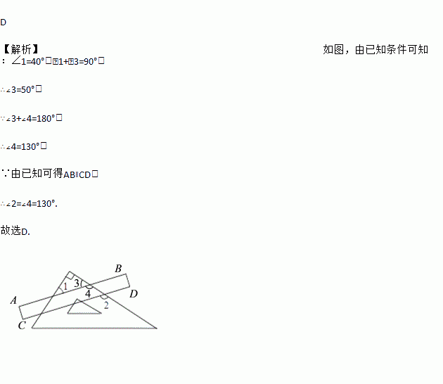 把一块直尺与一块三角板如图放置,若∠1=40°,则∠2的度数为( )