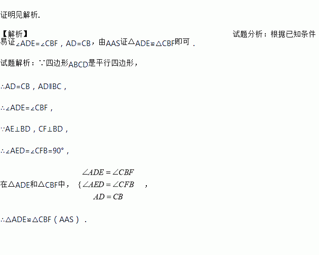 已知:如图,在平行四边形ABCD中,AE⊥BD,CF⊥BD,垂足分别为E,F.求证:△ADE≌△CBF .
