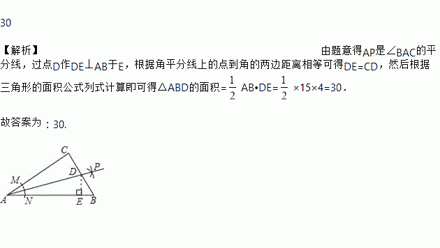 MN的长为半径画弧,两弧交于点P,作射线AB交边BC于点D,若CD=4,AB=15,则△ABD的面积是__.