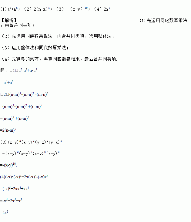 (1)a2·a3+a·a5 (2) (n-m)3·(m-n)2 -(m-n)5