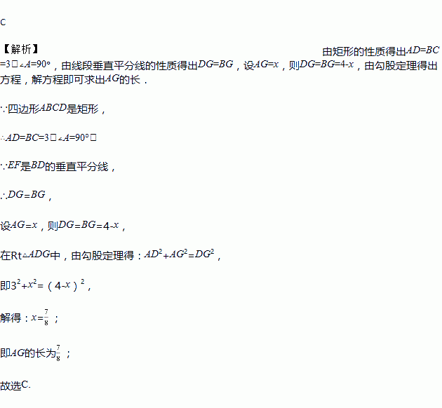 如图,在矩形ABCD中,用直尺和圆规作BD的垂直平分线EF,交AB于点G,交DC于点H,若AB=4,BC=3,则AG的长为( )
