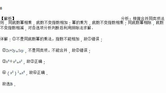 下列运算:①x2+x4=x6 ②2x+3y=5xy ③x6÷x3=x3 ④(x3)2=x6,其中正确的有( )