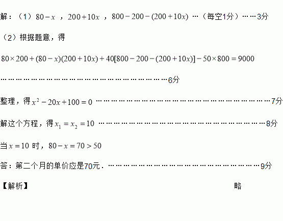 (9分)某批发商以每件50元的价格购进800件T恤,第一个月以单价80元销售,售出了200件;第二个月如果单价不变,预计仍可售出200件,批发商为增加销售量,决定降价销售,根据市场调查,单价每降低1元,可多售出10件,但最低单价应高于购进的价格;第二个月结束后,批发商将对剩余的T恤一次性清仓销售,清仓是单价为40元,设第二个月单价降低