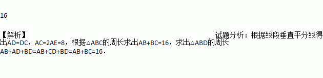 如图,△ABC的周长为24,AC的垂直平分线交BC于点D,垂足为E,若AE=4,则△ADB的周长是_______.
