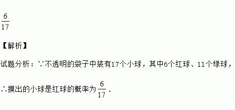 一个不透明的袋子中装有17个小球,其中6个红球、11个绿球,这些小球除颜色外无其它差别,从袋子中随机摸出一个小球,则摸出的小球是红球的概率为 .