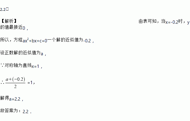 已知二次函数y=ax2+bx+c(a≠0,a,b,c为常数),对称轴为直线x=1,它的部分自变量x与函数值y的对应值如下表,写出方程ax2+bx+c=0的一个正数解的近似值_________.(精确到0.1)