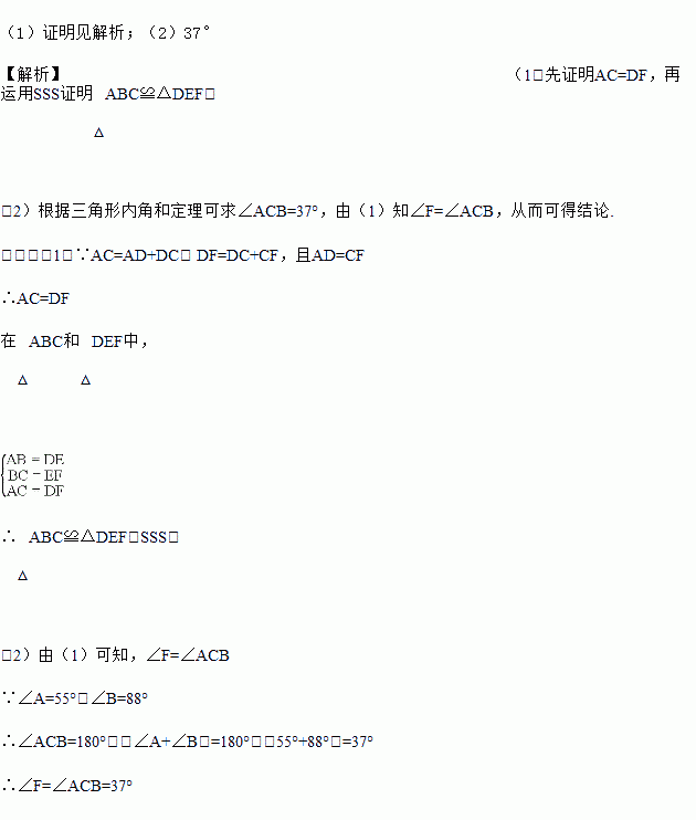 (2)若∠A=55°,∠B=88°,求∠F的度数.
