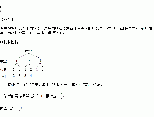 甲盒中装有3个乒乓球,分别标号为1、2、3;乙盒中装有2个乒乓球,分别标号为1、2.现分别从每个盒中随机取出1个乒乓球,则取出的两个乒乓球的标号之和为4的概率是________________.