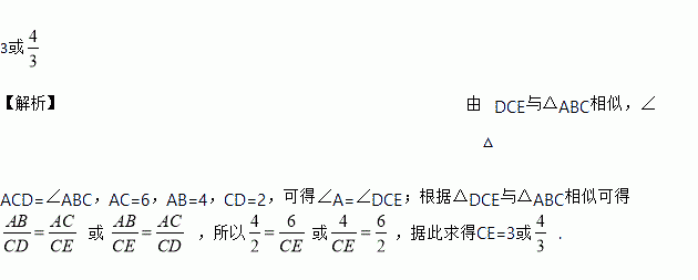 如图,△ABC中,AC=6,AB=4,点D与点A在直线BC的同侧,且∠ACD=∠ABC,CD=2,点E是线段BC延长线上的动点,当△DCE和△ABC相似时,线段CE的长为_____.