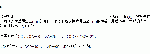 如图,已知AB是⊙O的直径,⊙O的切线CD与AB的延长线交于点D,点C为切点,联接AC,若∠A=26°,则∠D的度数是( )
