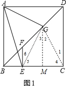 分析 (1)作GM⊥BC于M,连接GE、GC,如图1,由正方形的性质得DA=DC,∠ADB=∠CDB=45°,再证明△ADG≌△CDG得到AG=CG,∠DAG=∠1,∠AGD=∠CGD,接着利用等腰三角形的判定与性质得到GC=GE,∠5=∠4,∠2=∠3,从而得到∠1=∠6=∠DAG,GA=GE,再证明△AGE为等腰直角三角形得到∠AEG=45°,从而得到∠FEA+∠DAG=45°;