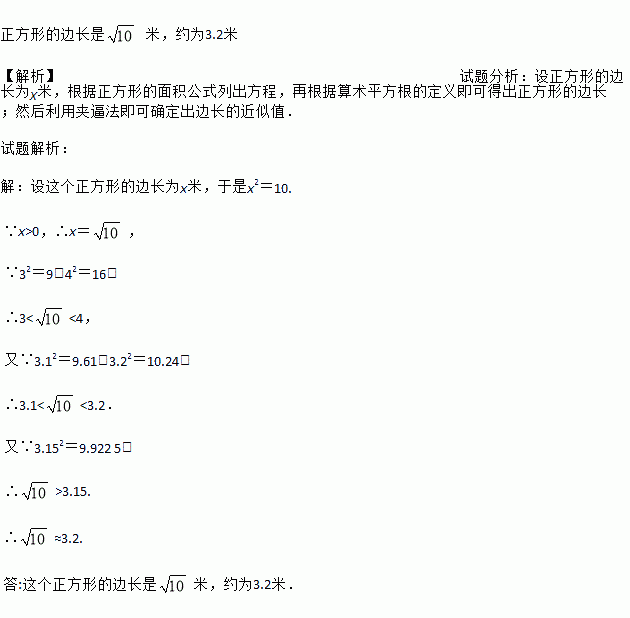 某公司要设计一块面积为10平方米的正方形广告牌,公司在设计广告时,必须知道这个正方形的边长.这个正方形的边长是多少?估计边长的值(结果精确到十分位).