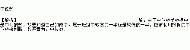 中位数 【解析】【解析】 由于中位数是数据中最中间的数,故要知道自己的成绩,属于班级中较高的一半还是较低的一半,应该利用数据的中位数来判断.故答案为:中位数.