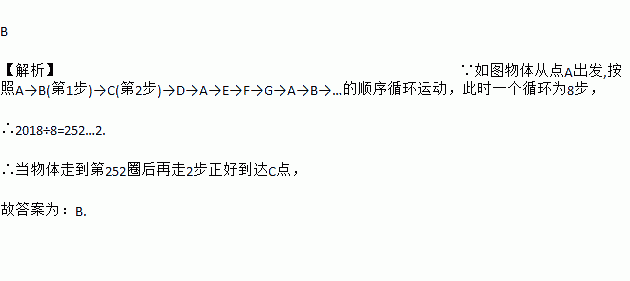 B 【解析】∵如图物体从点A出发,按照A→B(第1步)→C(第2步)→D→A→E→F→G→A→B→…的顺序循环运动,此时一个循环为8步, ∴2018÷8=252…2. ∴当物体走到第252圈后再走2步正好到达C点, 故答案为:B.