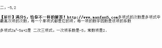 多项式3x2-5x+2是 次三项式,一次项系数是 ,常数项是 。