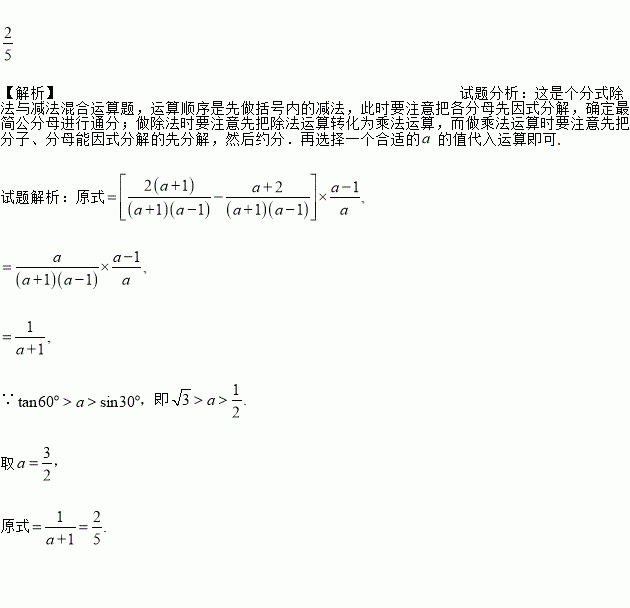 (﹣)÷,其中tan60°>a>sin30°,请你取一个合适的数作为a的值代入求值.