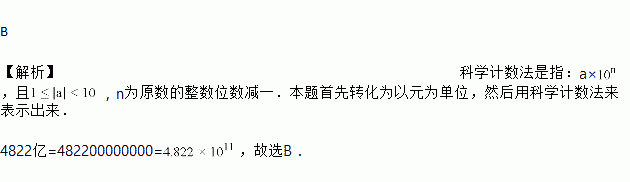 根据国家旅游局数据中心综合测算,今年国庆期间全国累计旅游收入4 822亿元,用科学记数法表示4 822亿正确的是( )