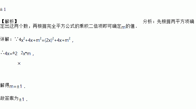 若二次三项式4x2+ 4x+m2是一个完全平方式,则字母m的值是______