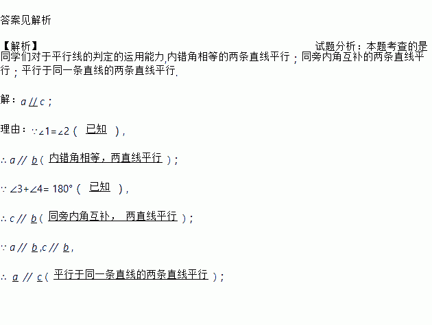 已知:如图:∠1=∠2,∠3+∠4= 180°;确定直线a,c的位置关系,并说明理由;