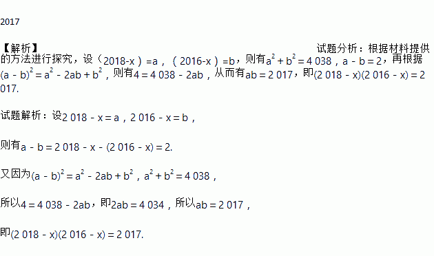 “若x满足(2018-x)2+(2016-x)2=4 038,试求(2018-x)(2 016-x)的值.”