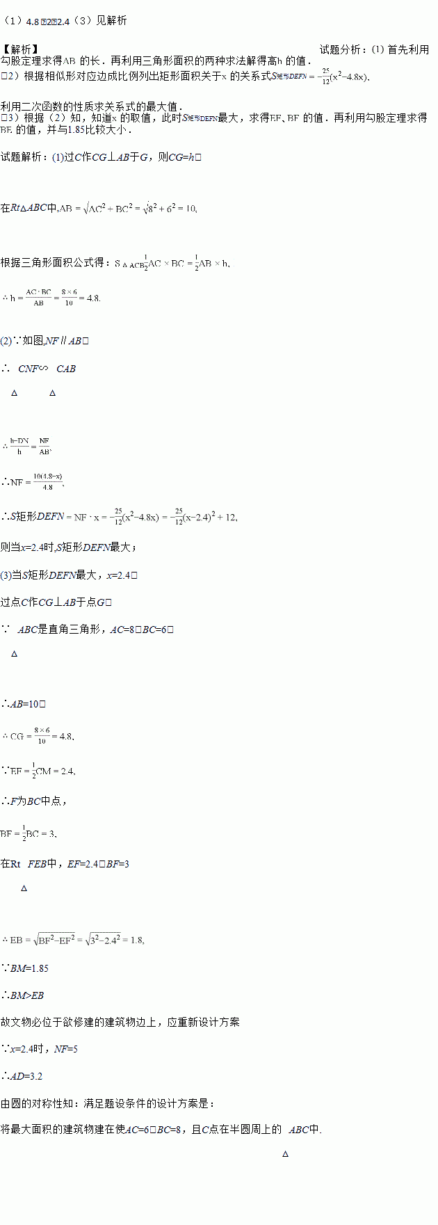 在直径为AB的半圆内,划出一块三角形区域,如图所示,使三角形的一边为AB,顶点C在半圆圆周上,其它两边分别为6和8,现要建造一个内接于△ABC的矩形水池DEFN,其中D、E在AB上,如图24-94的设计方案是使AC=8,BC=6.