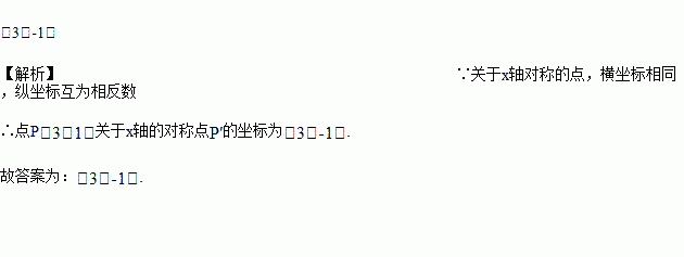点P(3,1)关于x轴的对称点P′的坐标是_________.