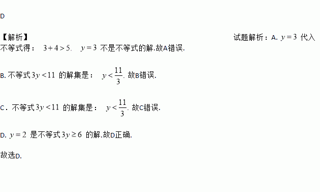C. 不等式3y<11的解集是y=3 D. y=2是不等式3y≥6的解