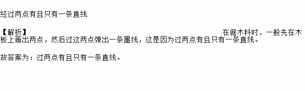 经过两点有且只有一条直线 【解析】在锯木料时,一般先在木板上画出两点,然后过这两点弹出一条墨线,这是因为过两点有且只有一条直线。 故答案为:过两点有且只有一条直线。