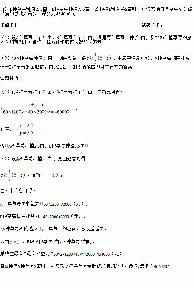 (1)若该农场每年草莓全部被采摘的总收入为460000元,那么A、B两种草莓各种多少亩?