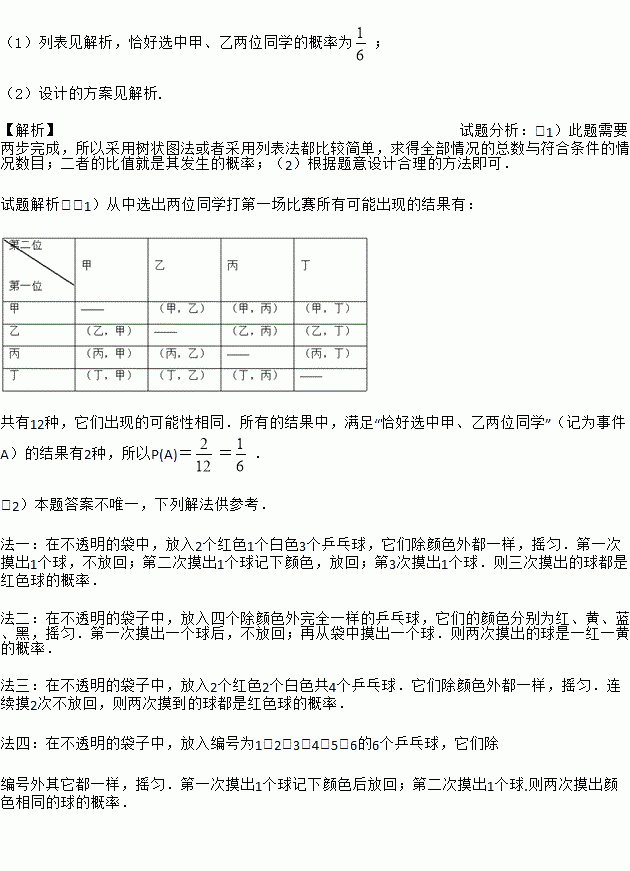 (1)列表见解析,恰好选中甲、乙两位同学的概率为; (2)设计的方案见解析. 【解析】试题分析:(1)此题需要两步完成,所以采用树状图法或者采用列表法都比较简单,求得全部情况的总数与符合条件的情况数目;二者的比值就是其发生的概率;(2)根据题意设计合理的方法即可. 试题解析:(1)从中选出两位同学打第一场比赛所有可能出现的结果有: 共有12种,它们出现的可能性相同.所有的结...