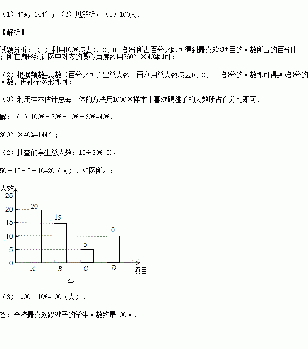 (3)若该校有学生1000人,请根据样本估计全校最喜欢踢毽子的学生人数约是多少?