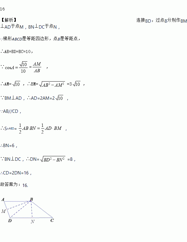 如果一个四边形的某个顶点到其他三个顶点的距离相等,我们把这个四边形叫做等距四边形,这个顶点叫做这个四边形的等距点.如图,已知梯形ABCD是等距四边形,AB∥CD,点B是等距点.若BC=10,cosA=