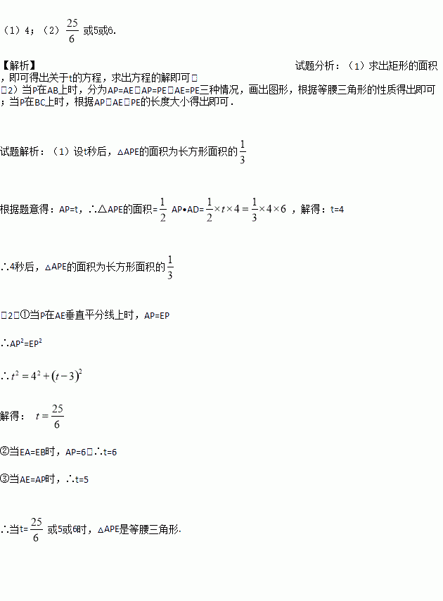 (2)在整个运动过程中,t为何值时,△APE为等腰三角形?![]()