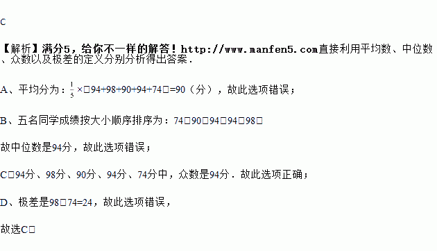 某学习小组的五名同学在一次数学竞赛中的成绩分别是94分、98分、90分、94分、74分,则下列结论正确的是( )