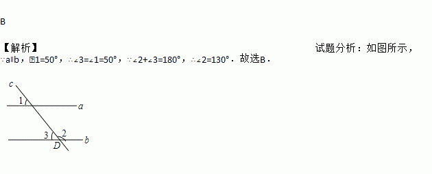 (4分)如图,直线a∥b,直线c分别与a,b相交,∠1=50°,则∠2的度数为( )
