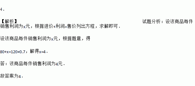 4. 【解析】试题分析:设该商品每件销售利润为x元,根据进价+利润=售价列出方程,求解即可. 设该商品每件销售利润为x元,根据题意,得 80+x=120×0.7,解得x=4. 答:该商品每件销售利润为4元. 故答案为4.