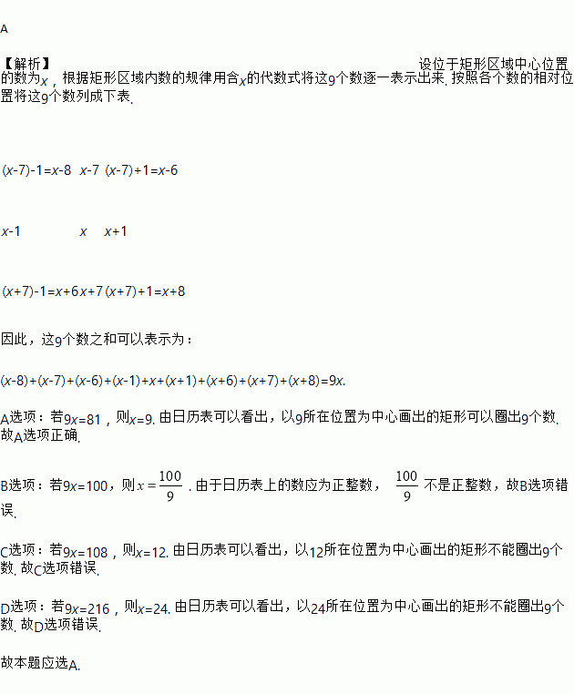 如图是某月的日历表,在此日历表上可以用一个矩形圈出3×3个位置的9个数(如6,7,8,13,14,15,20,21,22).若用这样的矩形圈圈这张日历表的9个数,则圈出的9个数的和可能为下列数中的( )