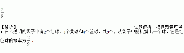 一个不透明的袋子中有2个红球、3个黄球和4个蓝球,这些球除颜色外完全相同,从袋子中随机摸出一个球,它是红色球的概率为________________________.