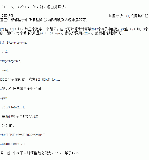 (1)-5;(2)8;(3)能.理由见解析. 【解析】试题分析:(1)根据其中任意三个相邻格子中所填整数之和都相等,列方程求解即可; (2) 由(1)知,每三个数字一个循环,由此可计算出计算第2017个格子中的数;(3)由(2)知,3个数一循环,每个循环的和是8+(﹣5)+2=5,所以只要用2020÷5,然后进行判断即可. (1) ∵8+x+y=x+y+z, ∴z=8; ...