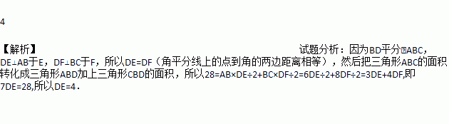如图,BD平分∠ABC,DE⊥AB于E,DF⊥BC于F,AB=6,BC=8.若S△ABC=28,则DE= .
