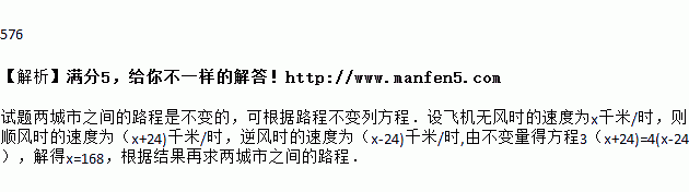 一架飞机飞行在两城市之间,风速为24km/h,顺风飞行需3h,逆风飞行需4h,则两个城市间的飞行路程为 km.
