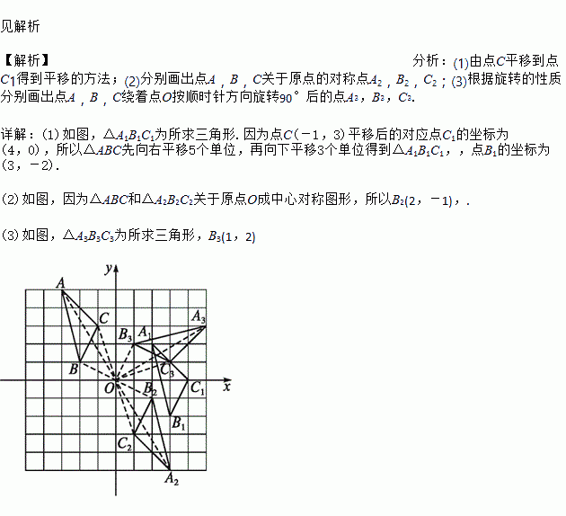 (3)将△ABC绕着点O按顺时针方向旋转90°得到△A3B3C3,,画出图形并写出△A3B3C3顶点B3的坐标.