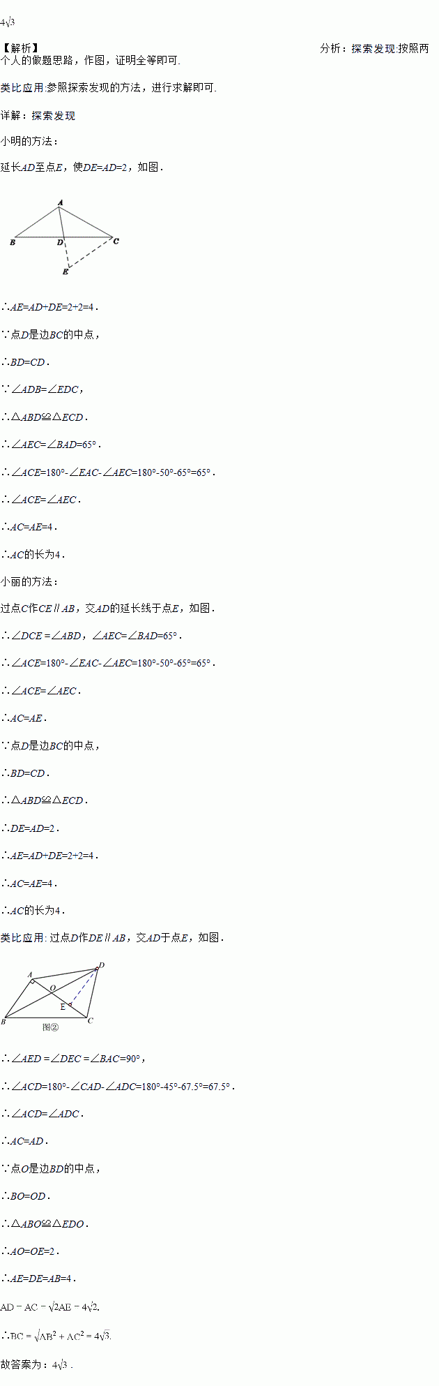 小明的思路是:延长AD至点E,使DE=AD,构造全等三角形.