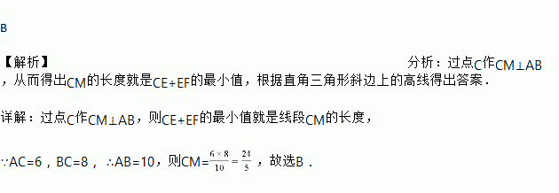 如图所示,Rt△ABC中,∠ ACB =90°,AC=6,BC=8,AD平分∠CAB交BC于D点,E、F分别是AD、AC上的动点,使CE+EF的和最小,则这个最小值为( )