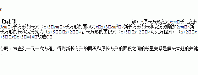 一个长方形的长比宽多3 cm,如果把它的长和宽分别增加2 cm后,面积增加14 cm2,设原长方形宽为x cm,依题意列方程应为( )