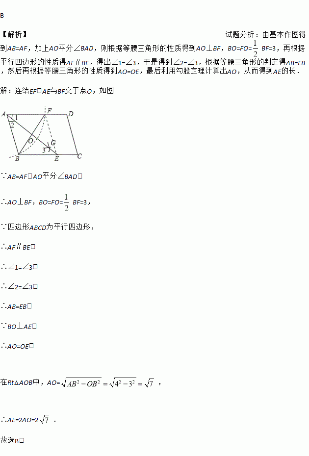 如图,在?ABCD中,用直尺和圆规作∠BAD的平分线AG交BC于点E,若BF=6,AB=4,则AE的长为( )