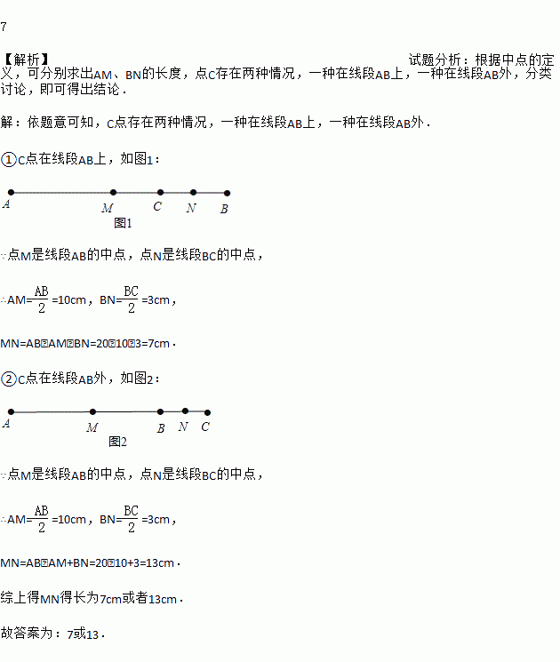 7 【解析】试题分析:根据中点的定义,可分别求出AM、BN的长度,点C存在两种情况,一种在线段AB上,一种在线段AB外,分类讨论,即可得出结论. 【解析】 依题意可知,C点存在两种情况,一种在线段AB上,一种在线段AB外. ①C点在线段AB上,如图1: ∵点M是线段AB的中点,点N是线段BC的中点, ∴AM==10cm,BN==3cm, MN=AB﹣AM﹣BN...