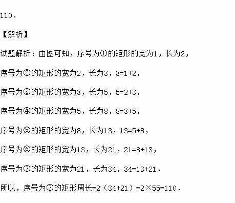 意大利著名数学家斐波那契在研究兔子繁殖问题时,发现有这样一组数:1,1,2,3,5,8,13,…,其中从第三个数起,每一个数都等于它前面两个数的和.现以这组数中的各个数作为正方形的边长值构造正方形,再分别依次从左到右取2个、3个、4个、5个…正方形拼成如上长方形,若按此规律继续作长方形,则序号为⑦的长方形周长是 .