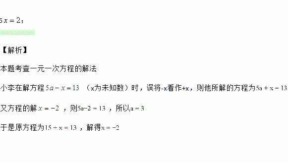 小明在解方程5a-x=13(x为未知数)时,误将-x看作+x,得到方程的解为x=-2,则原方程的解为___________.