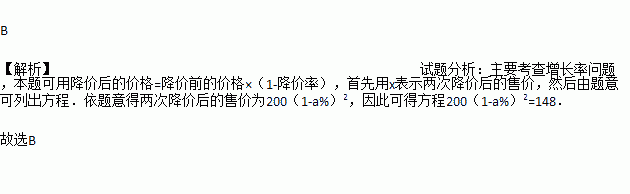 A. 200(1+a%)2=148 B. 200(1﹣a%)2=148 C. 200(1﹣2a%)=148 D. 200(1﹣a2%)=148